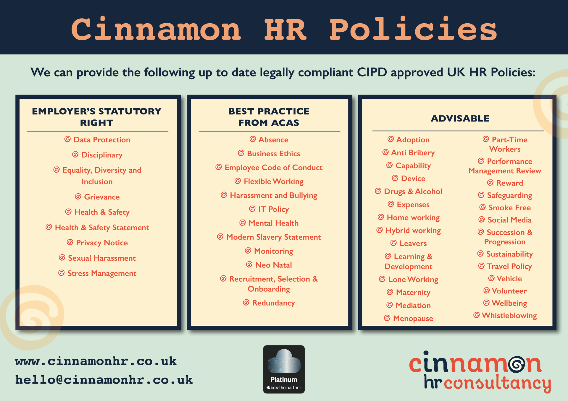Our clients tell us that having HR policies in place gives them real peace of mind. While most employees would never dream of threatening legal action there is always the chance. Ensuring that you have up to date and professionally-written HR policies can mitigate this risk. We are proud at Cinnamon HR that all of our HR policies are legally compliant and approved by the CIPD. This also means that they are underpinned by our professional indemnity insurance.